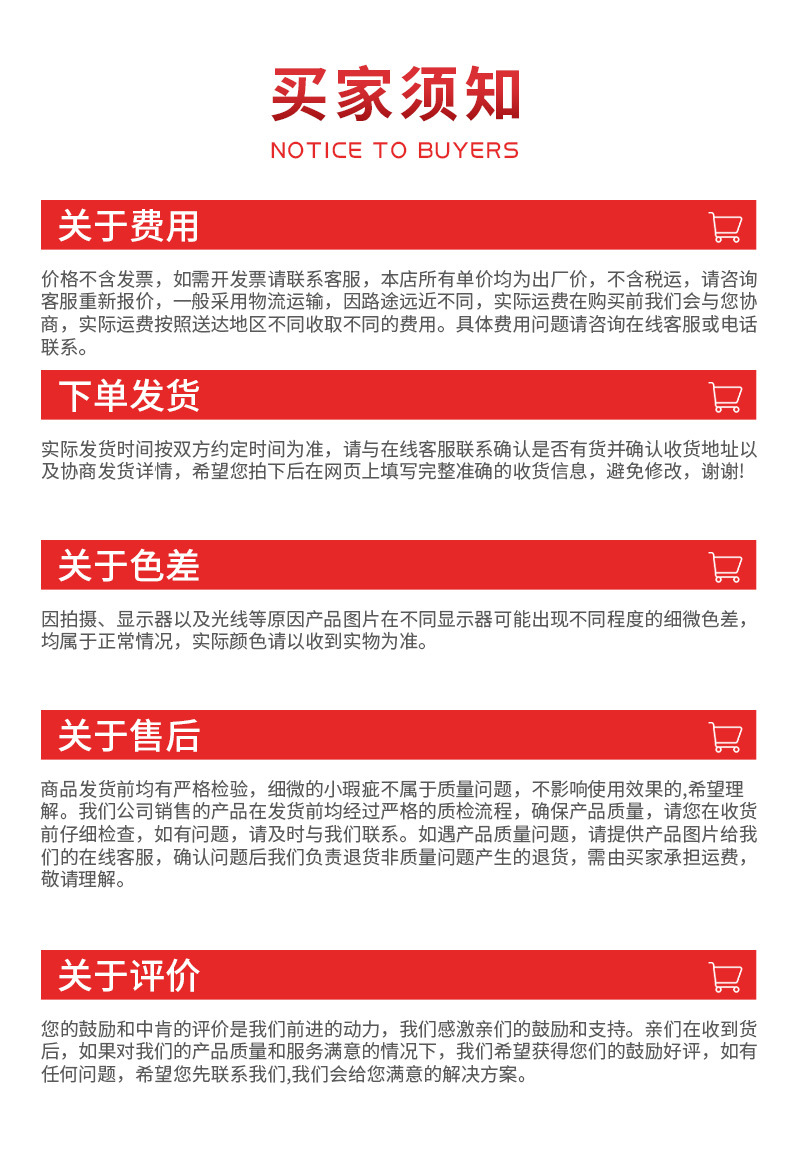 特此说明:因为我们的产品都是以批发为主,所有的价格都是不含运费,不含票税的价格。如需发票等相关事宜请与客服联系。否则,我公司视您已知道该条款。造成的后果本部概不负责。