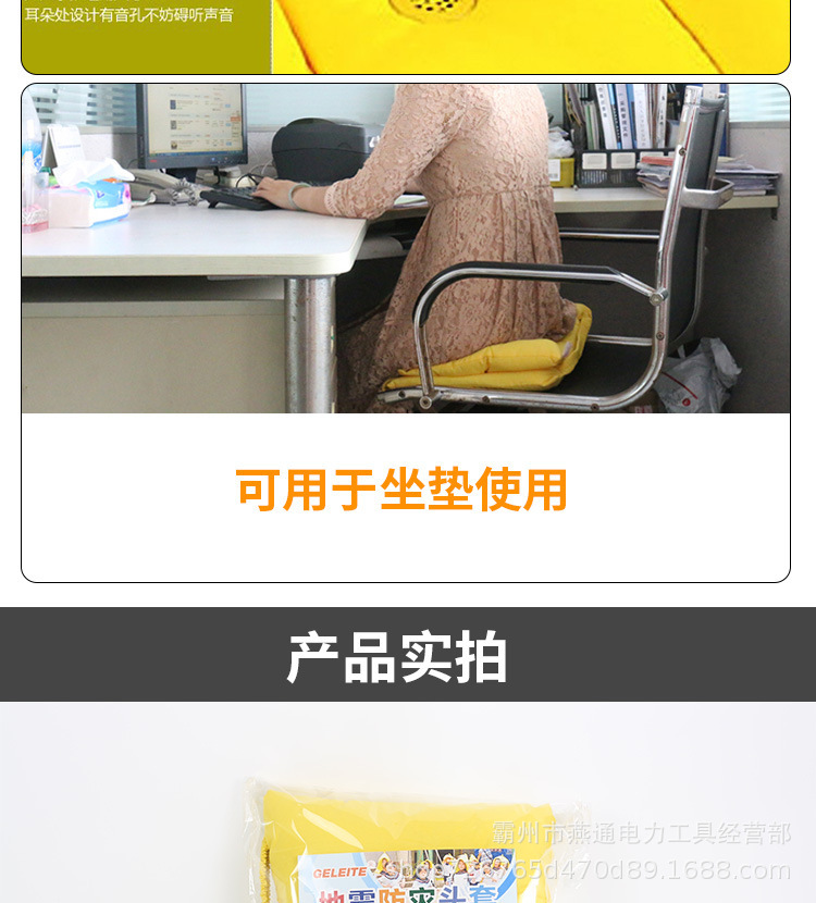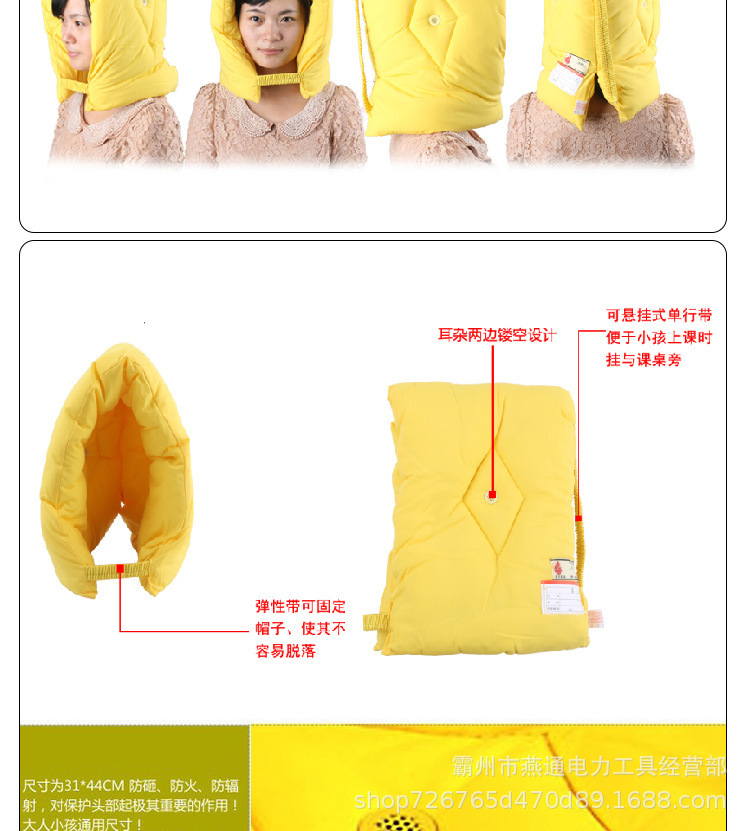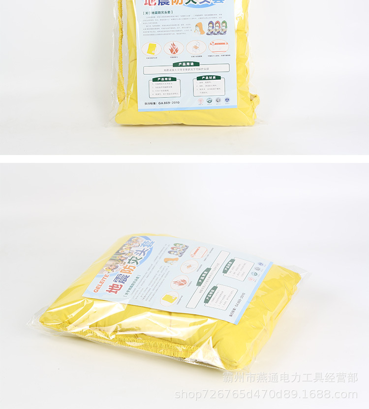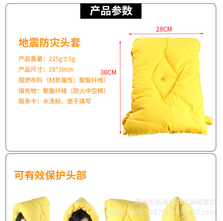 名称:地震防灾头套 材质:阻燃布+棉 规格:37cm*32cm 颜色:醒目橙色 性能:携带方便,小巧、美观、实用 备注:防灾应急防护头套能有效保护头部,在灾难时套在头.上防止坠落物品等砸伤头部等意外伤害,极端灾害如风雪中可以防寒保暖,平时不用还可以当坐垫、靠枕、枕头等使用,是家庭防灾推荐的应急用品。 由于市场价格不稳定,派单前请一定要联系客服核实或拨打首页电话曹经理, 否则不发货,请朋友们谅解! |