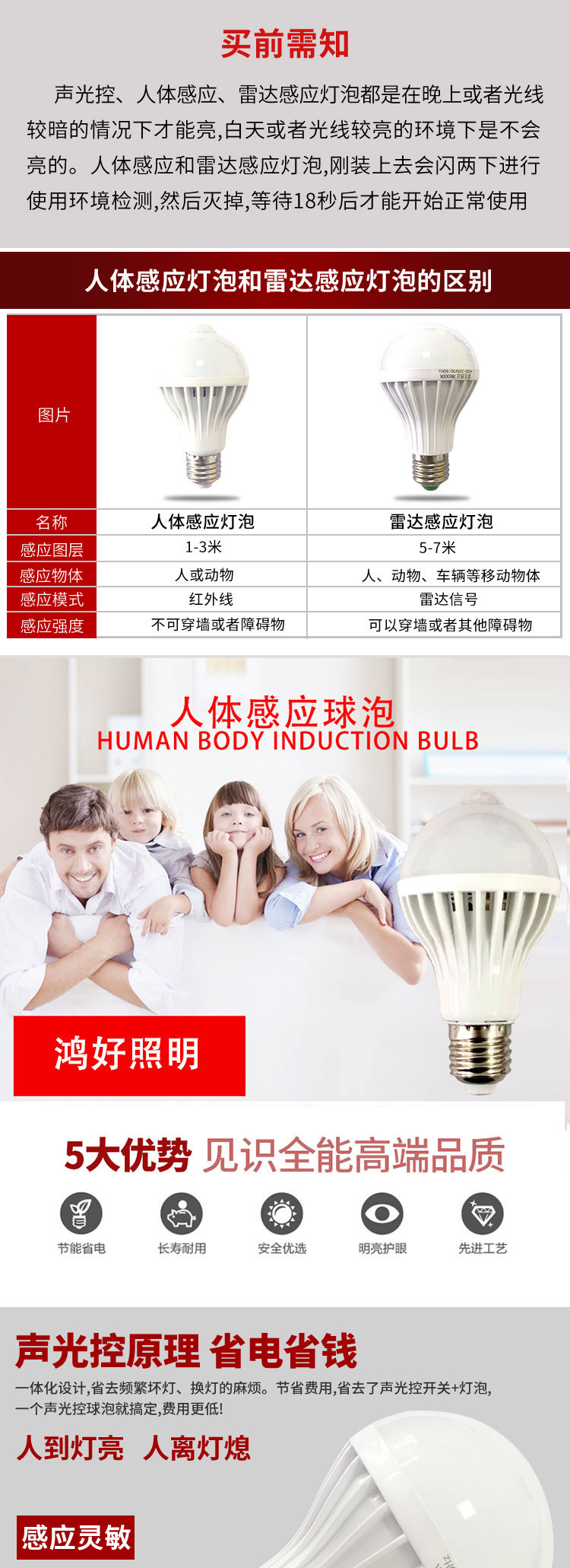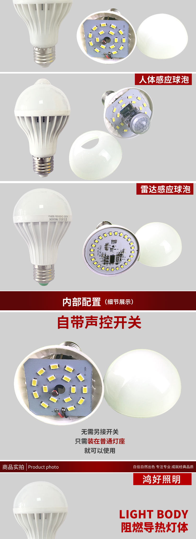 led跨境宽压红外线人体感应灯泡声光控雷达球泡E27物业110V感应灯