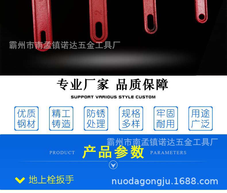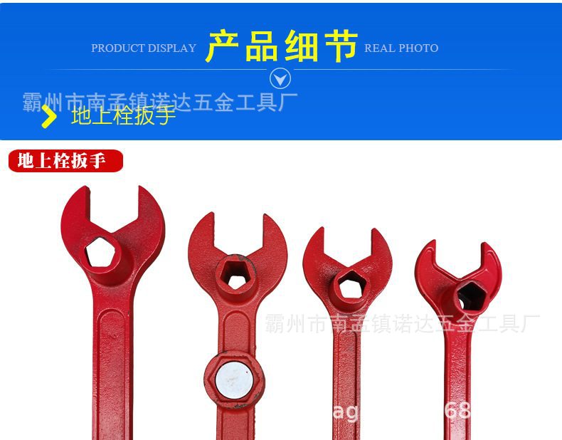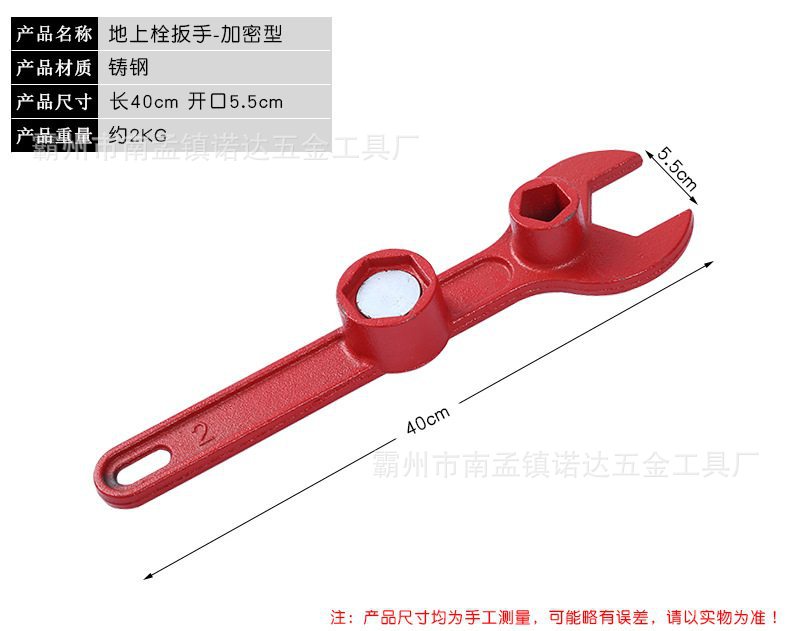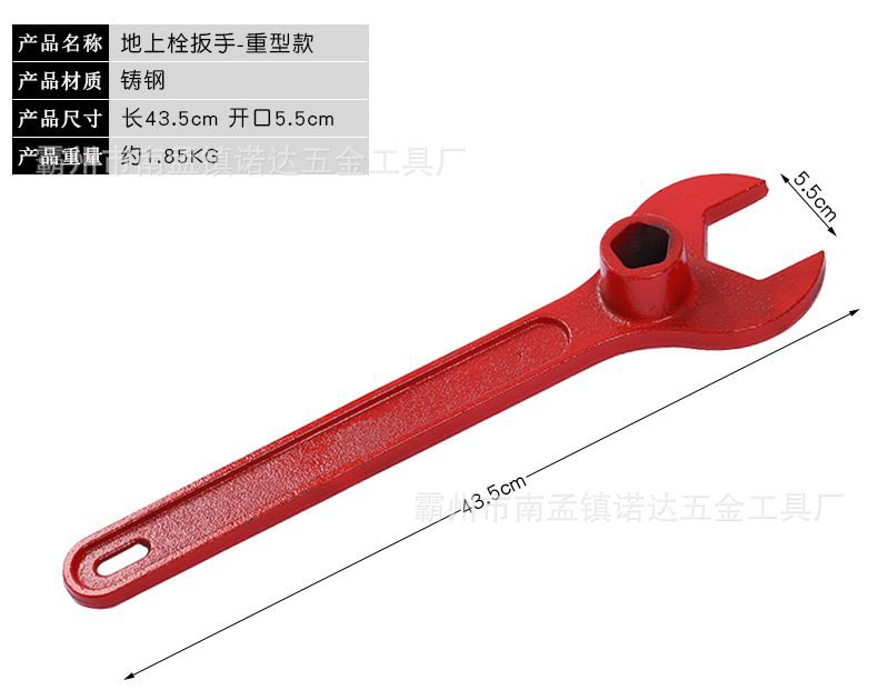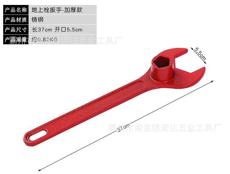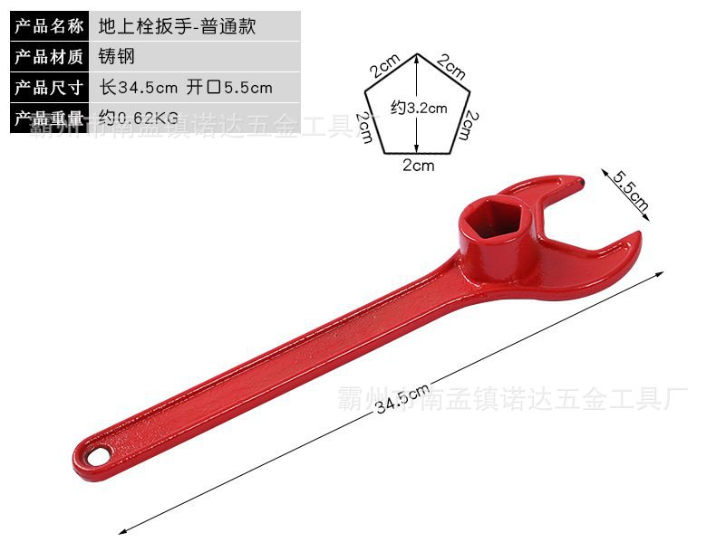 由扳手由异型钳口、手柄、套筒开关、磁压式开关,开口大,带磁压式开关材料:航空铝和特种钢制作, 重量:2.2kg+0.1kg。 套筒尺寸: 六边形套筒边长26mm; 五边形套筒尺寸:边长20mm、斜度1:10; 功能参数: 可以打开尺寸不标准、生锈、打滑的老式地上消火栓、新式磁吸 式地上消火栓和水泵接合器的扪盖; 扳手由手柄、套筒和可活动的异形钳口等组成; 手柄上设有套筒开关,可实现一把扳手开启各种规格的五方、六 方消火栓阀门; 扳手材料选用航空铝、45号钢、强磁等。