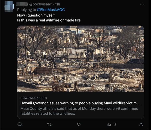 不过,乔什的表态却再次引发了美国网友对于此次火灾起源“阴谋论”的说法。据此前报道,在社交平台上有美国网友质疑,“夏威夷火灾究竟是不是自然灾害?”有网友发文并配图称,夏威夷的大火是美国政府有意为之,起火的原因是政府在测试“定向能武器”(Directed Energy Weapons)。但是相关说法和图片随即被美媒辟谣(红星新闻相关报道:夏威夷大火系政府测试武器引发?阴谋论浮现!“外来物种”或加剧了火灾破坏程度)。