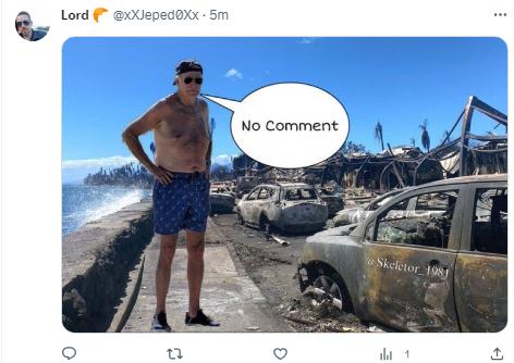 还有网友P图嘲讽拜登此前对有关夏威夷火灾提问的冷漠回应,图中,拜登依然表示“无可奉告”。↓