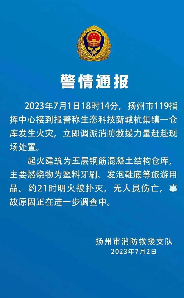 2日,扬州市消防救援支队发布警情通报:7月1日18时14分,扬州市119指挥中心接到报警称,生态科技新城杭集镇一仓库发生火灾,立即调派消防救援力量赶赴现场处置。起火建筑为五层钢筋混凝土结构仓库,主要燃烧物为塑料牙刷、发泡鞋底等旅游用品。约21时明火被扑灭,无人员伤亡,事故原因正在进一步调查中。
