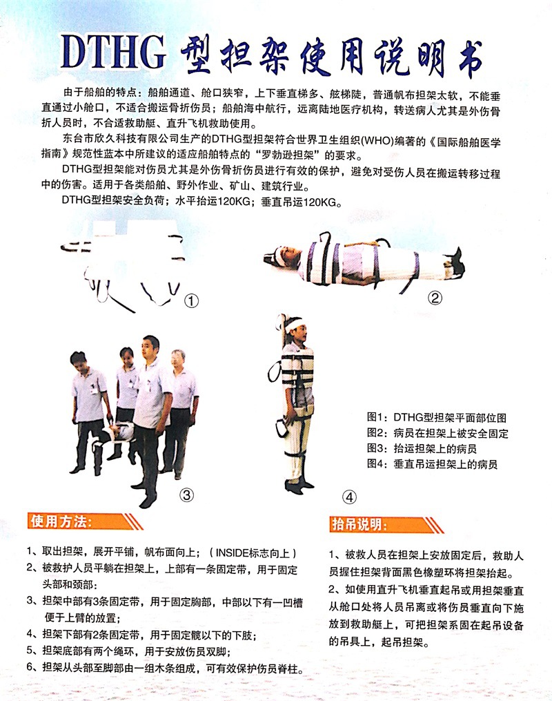 4、担架下部有2条固定带,用于固定髋以下的下肢; 放到救助艇上,可把担架系固在起吊设备5、担架底部有两个绳环,用于安放伤员双脚 的吊具上,起吊担架。
