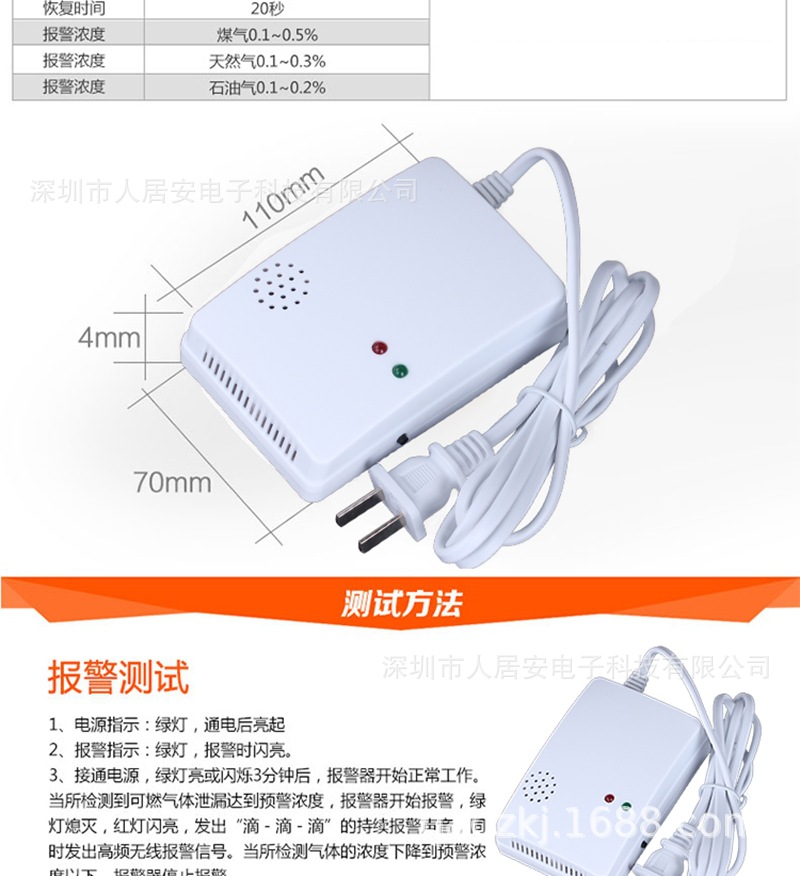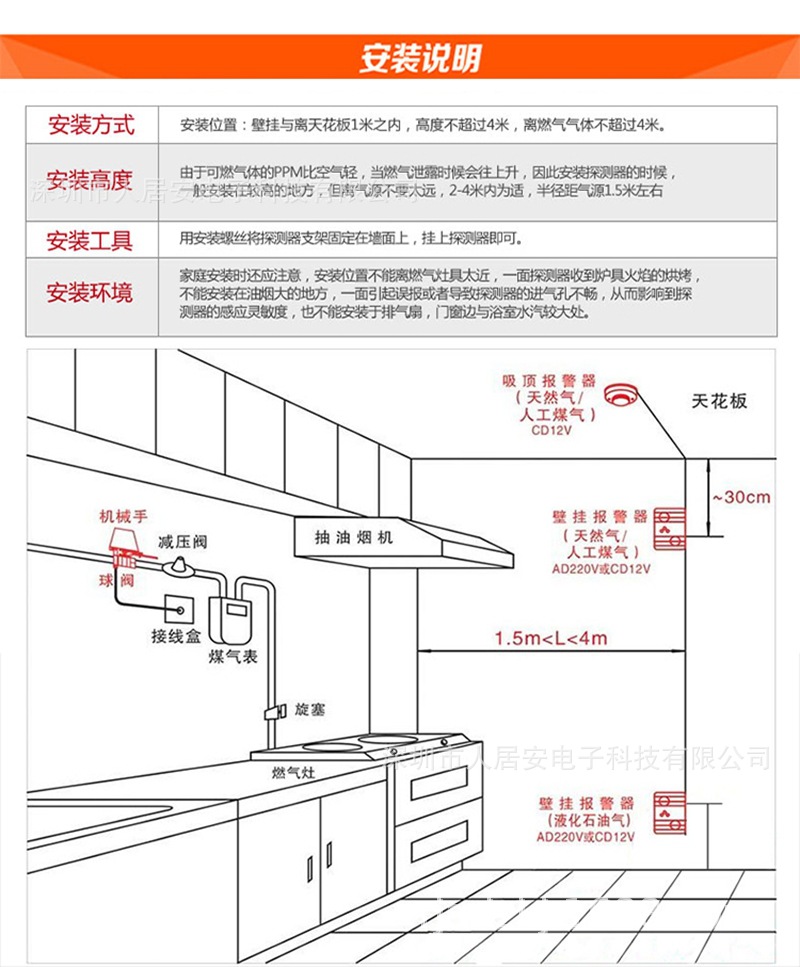燃气报警器壁挂式厨房天然气探测器220V家用可燃气体泄 漏报警器
